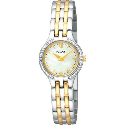... Stunning ladies Pulsar watch in a two-tone steel and gold-plated design. Further features include a mother of pearl dial bordered with sparkling stones ...